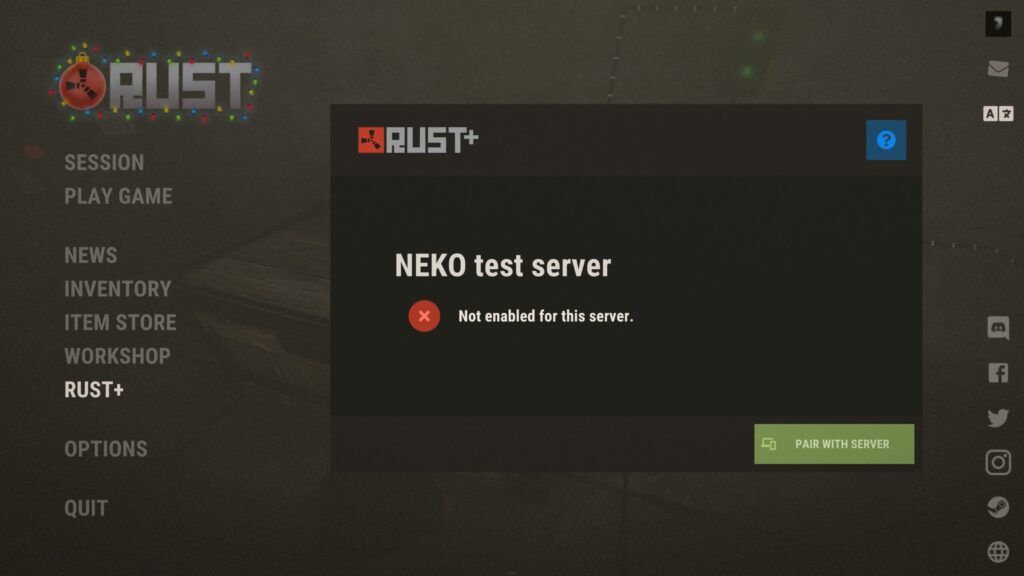 ESCを押して、RUST+のタブを見ます。緑色の「PAIR WITH SERVER」をクリックし、サーバーとアプリをペアリングしていきます。